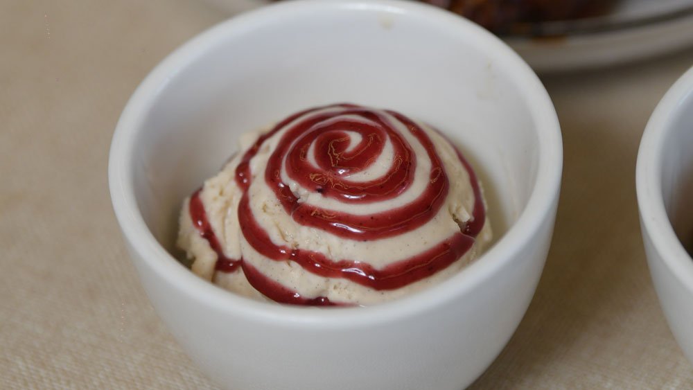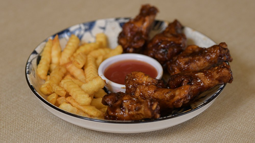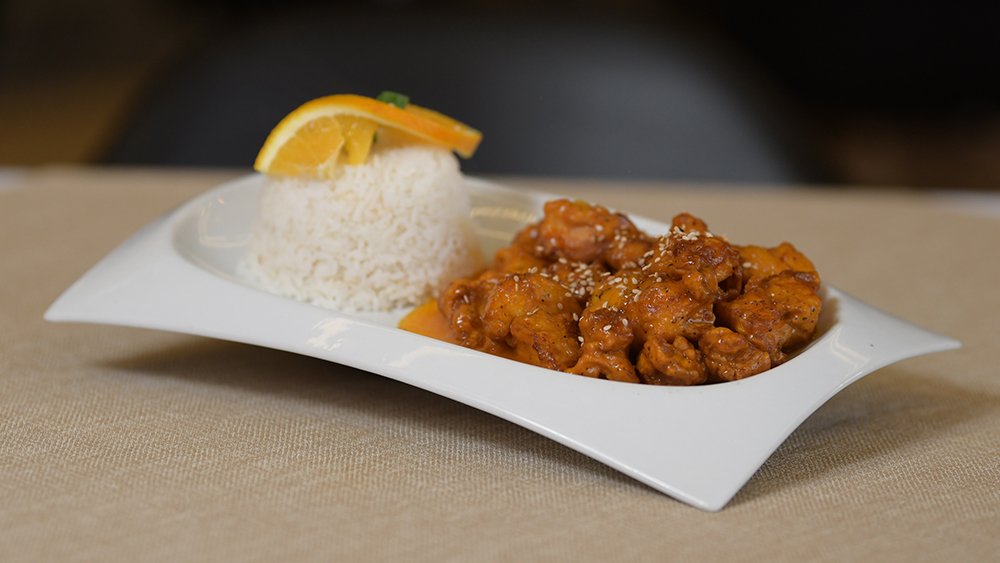 Pollo capeado en salsa de piña o naranja, acompañado de arroz blanco y de postre una bola de nieve. $180